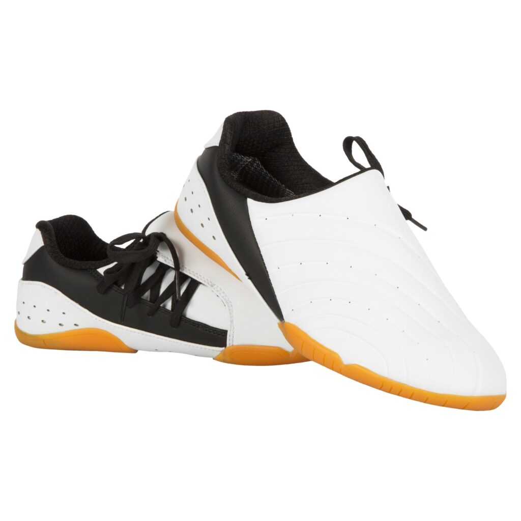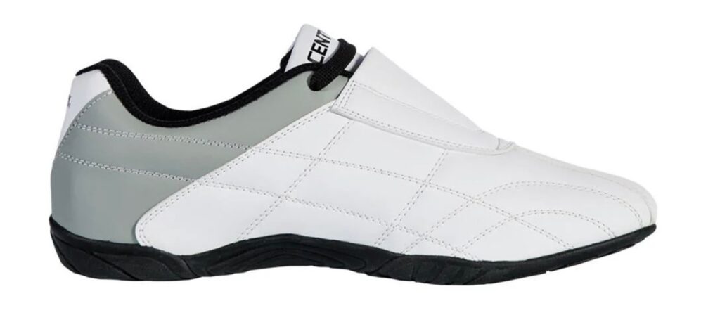 In addition we wear white soft-sole light weight martial arts style or “barefoot-style” shoes in training. In Japan, modern martial arts are often practiced barefoot, and traditional martial arts are practiced with tabi, which are cotton-soled moccasin-like socks, which would be worn with sandals when outside. America is a shoe-wearing culture and we do not normally remove shoes when entering a building. As such it makes more sense to wear shoes while training, but shoes need to have a soft sole so as to not be too painful for training partners to recieve techniques. See some examples below.
